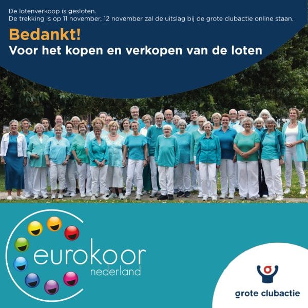 Bedankt voor jullie steun! Met trots kunnen we melden dat Eurokoor dit jaar een schitterende € 1.440,- heeft opgehaald tijdens de Grote Clubactie. In totaal werden er 600 loten verkocht, een geweldig resultaat waar we enorm blij mee zijn!